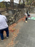 箒や熊手で葉っぱを集め大きなちりとりを使って袋へ纏めます。